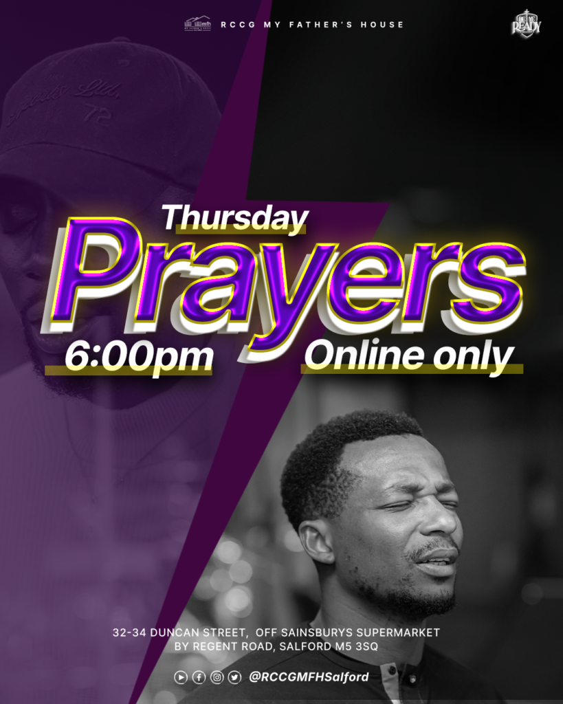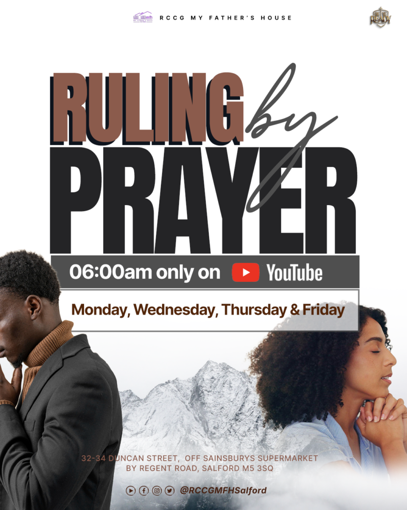 Kindly join us, #Rulingbyprayers with Pastor Sam Okodoa @samtdib 6am every Mon. Wed. Thurs & Fri. via YouTube #RCCGMFHSalford. See you soon by God’s grace.